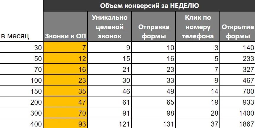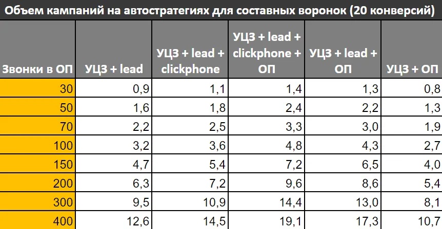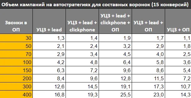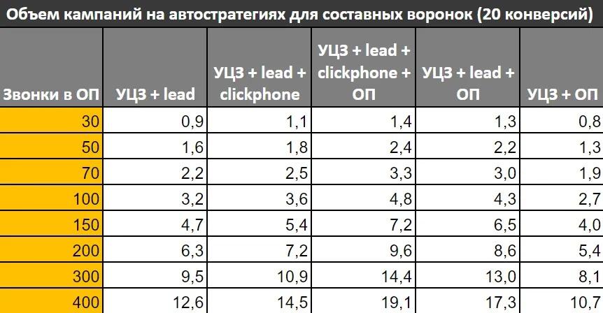 Почему же мы не используем всю воронку целей? По идее если сложить: «звонок в отдел продаж» + «уникально целевой звонок» + «отправку формы» + «клик по номеру телефона» можно получить в 4 раза больше конверсий для обучения, разберем в таблице ниже.