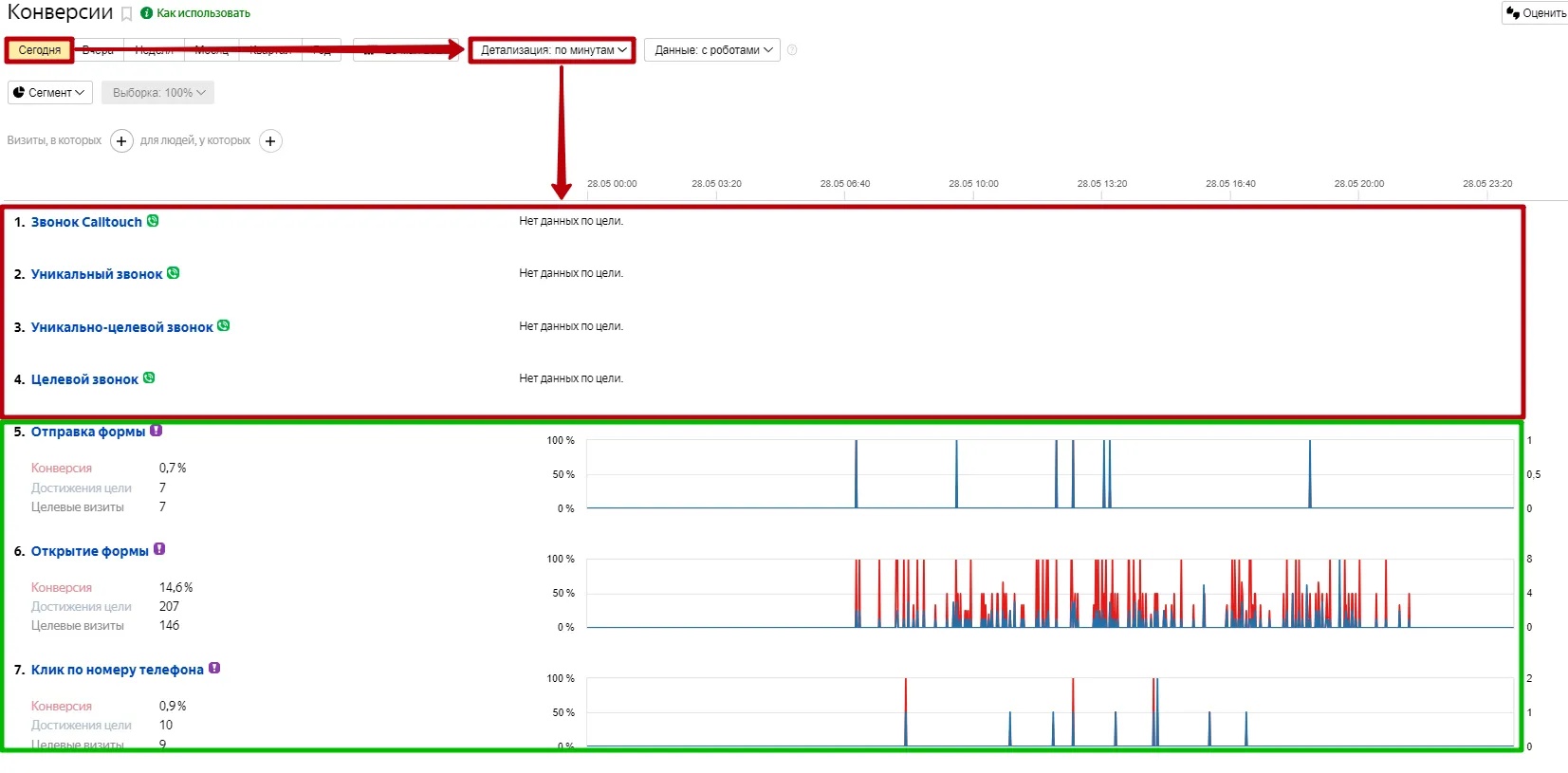 Пример фиксации целей из колтрекинга и Java Script. В разрезе дня мы можем поставить детализацию по минутам. После достижения JS цели через +-минуту можно увидеть достижения цели в метрике. Цели из колтрекинга передаются в метрику по API обычно ночью. Отобразятся в директе только к середине следующего дня.