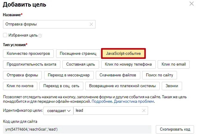 | Отправка формы | лид, lead | JS цель настроенная нашими программистами на идентификатор: lead |