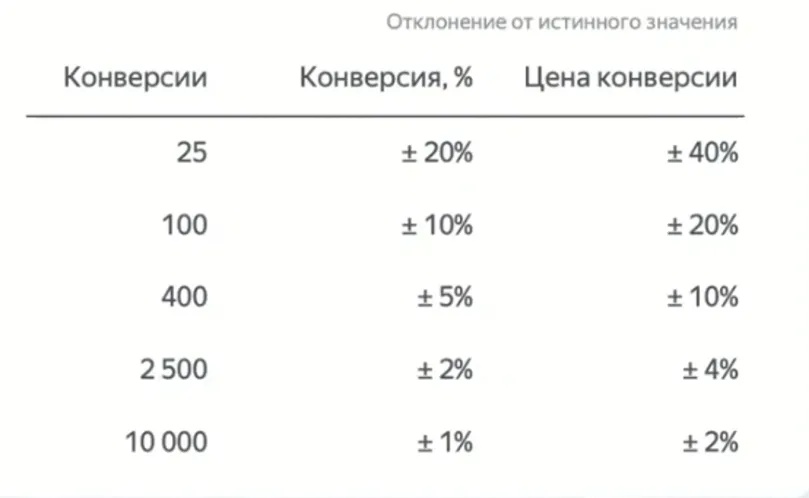 Хочу дополнить ее, при количестве конверсий менее 10, отклонение от цены конверсии может достигать +-100%.