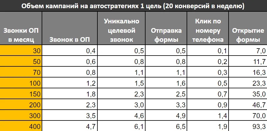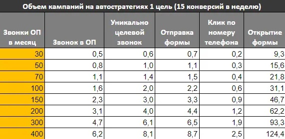 У этих кампаний один большой недостаток - не хватает объема конверсий для нормального обучения. В таблице приведено количество автостратегий, которые сможем обучить на 1 цель в зависимости от получаемого количества конверсий в неделю: 15 (нормально) 20 (отличное).