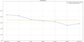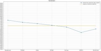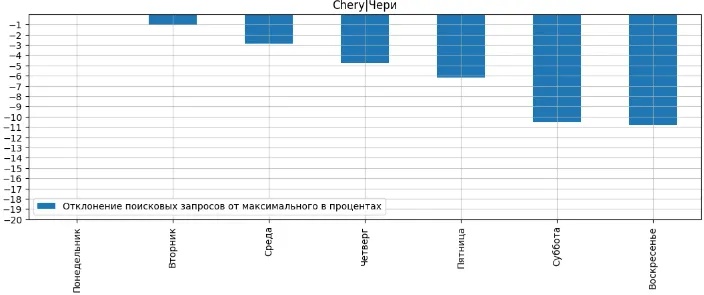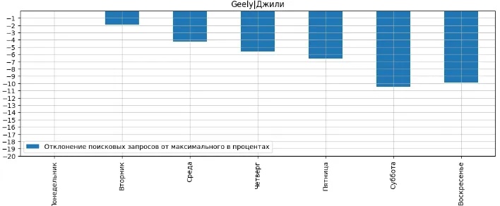 Далее посчитали среднее отклонение по каждому дню от максимального значения. Максимальное значение поисковой частотности по всем маркам наблюдается в понедельник.