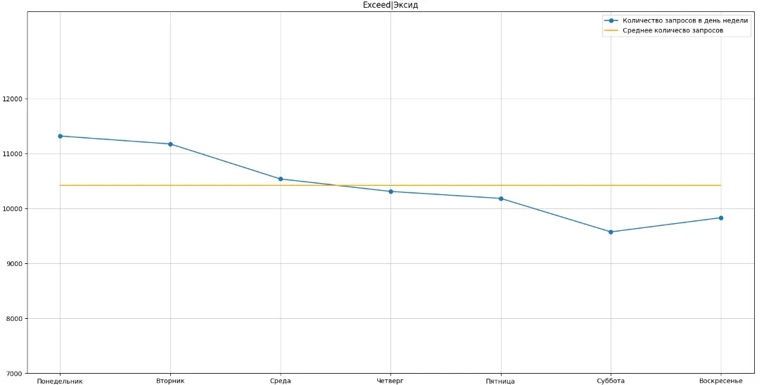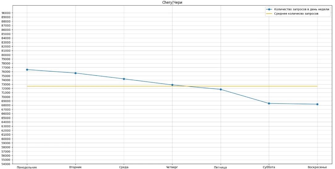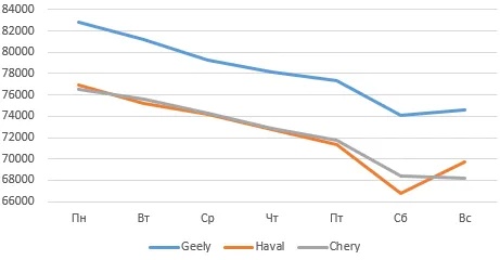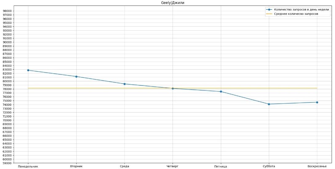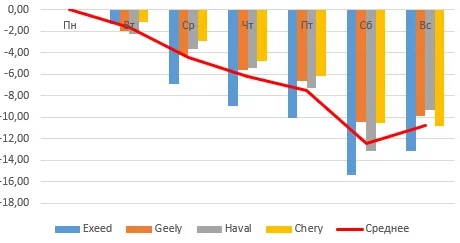 Собрали статистику по частоте запросов из WordStat по высокочастотным ключевым словам в 2 вариациях английское/русское написание по 4 брендам (exeed/эксид, haval/хавал, geely/джили, chery/чери) за 9 недель с 24.03.24 Посчитали среднюю частотность по дню недели (сложили частотность по дням недели и поделили на количество недель).