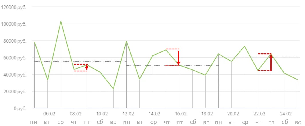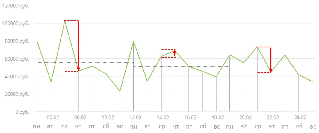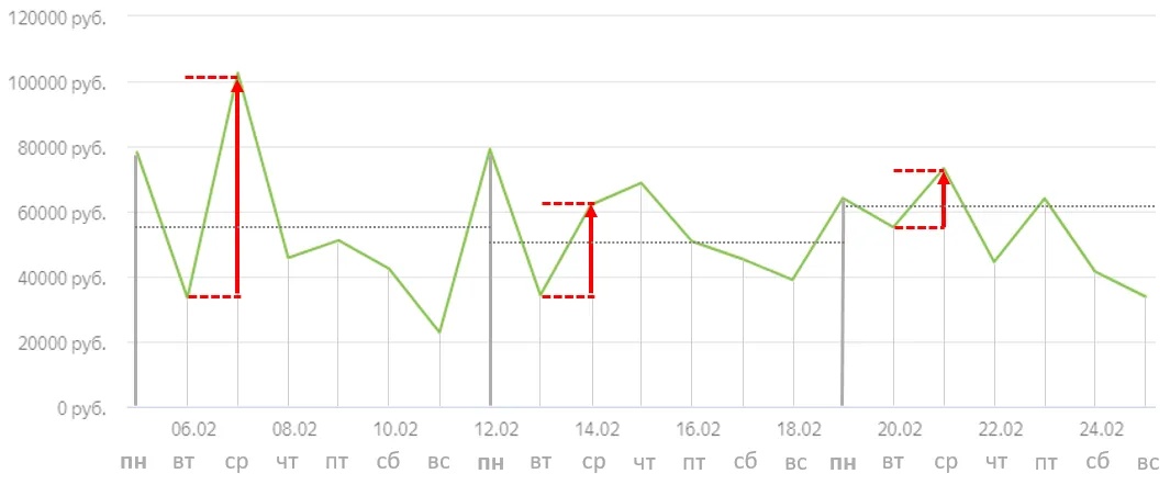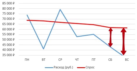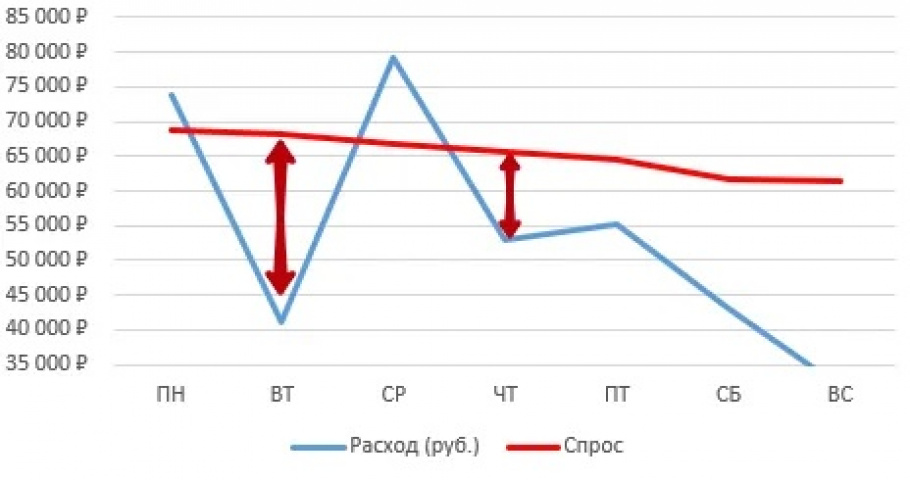 Основная логика подбора оптимальных дней масштабирования и сокращения бюджета состоит в том, чтобы сделать кривую расхода в течение недели максимально приближенной к кривой спроса.