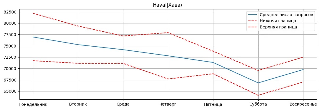 Доверительные интервалы для запроса Haval|Хавал с уровнем доверия 95%. По другим запросам картина похожая.