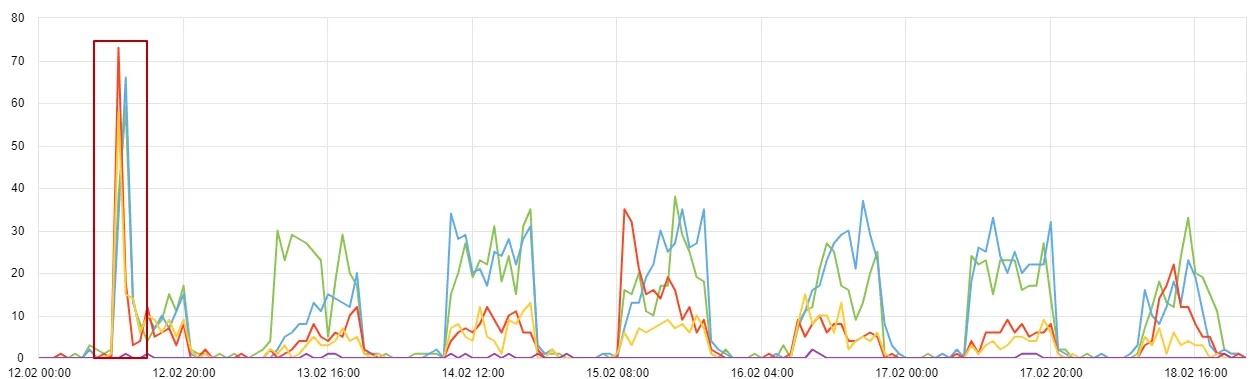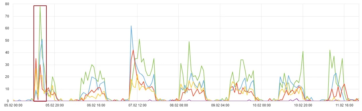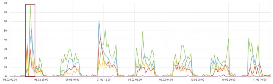 В этот день повышенные и неравномерные расходы. На общем графике можно видеть, что расходы ненамного больше, чем в другие дни. Почему же все ругаются на понедельник? Для этого нужно посмотреть отчет в метрике в разбивке по 10 минут. Можем видеть, что основное количество визитов (и трат) приходится на первую половину дня. После обеда кампании сильно урезают показы.