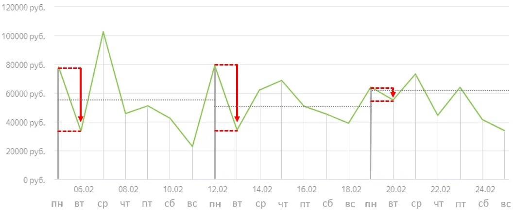 В понедельник не масштабируем и, по возможности, не запускаем новые кампании, так как из-за рестарта трат недельного бюджета (см. статью) можно пролить еще больше.
