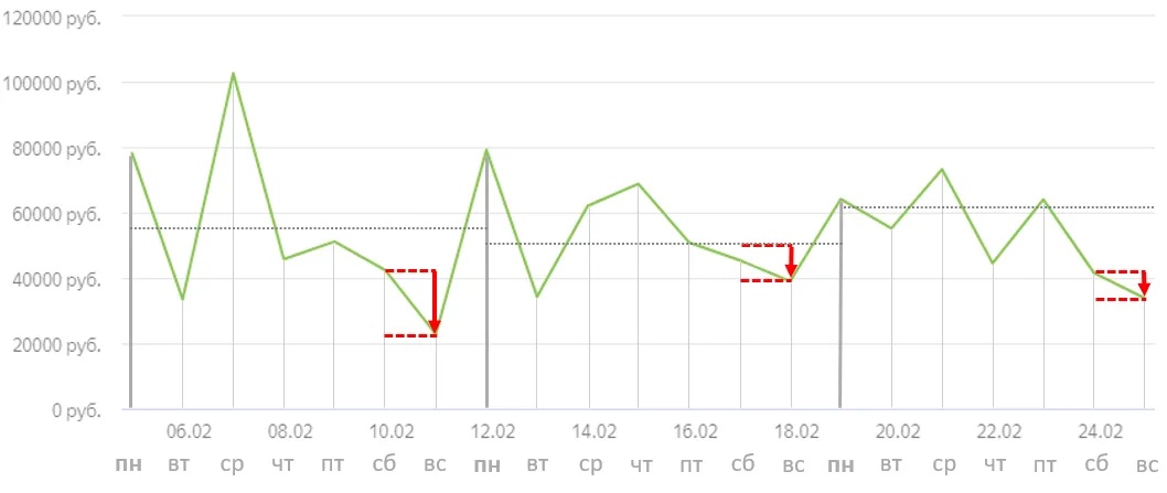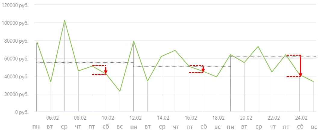 - Изменения спроса. В выходные спрос меньше, чем в будние