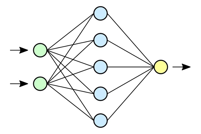 Нейрон — это вычислительная единица, которая получает информацию, производит над ней простые вычисления и передает ее дальше. Они делятся на три основных типа: входной (зеленый), скрытый (синий) и выходной (желтый).