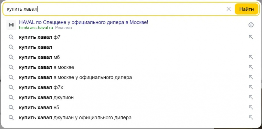 Приведем пример. Мы рекламируем дилерский центр Haval. Пользователь сидит в торговом центре рядом с дилерским центром, заходит с мобильного телефона и вводит запрос «цены на хавал». Его сигнал – поисковой запрос – проходит через нейронную сеть. Система генерирует решение – считает, насколько высоки шансы на то, что пользователь совершит конверсию. Нейросеть анализирует данные и видит – люди по запросам «цены на хавал» ранее уже конвертировались и звонили в отдел продаж узнать цену. Более того, пользователь уже находится в торговом центре, рядом с дилерским центром. А значит, если цель рекламной кампании – конверсии – нужно срочно поднять ставку на аукционе и во что бы то ни стало обойти конкурентов, чтобы пользователь увидел именно ваше объявление и пришел к вам.