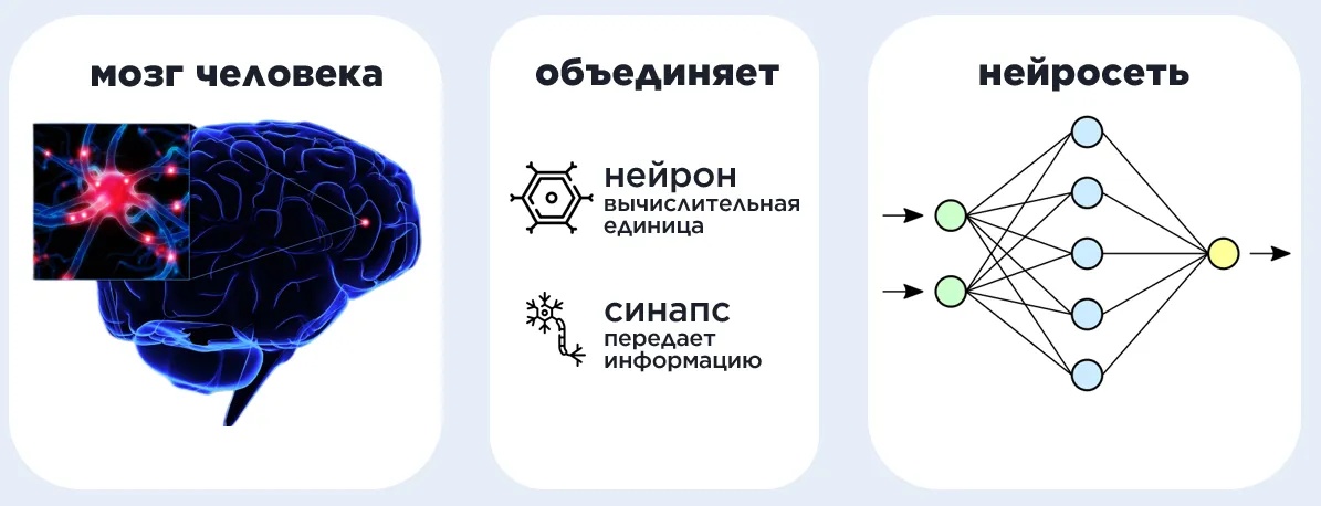 - Нейросеть сеть — машинная интерпретация мозга человека, в котором находятся миллионы нейронов передающих информацию в виде электрических импульсов.
