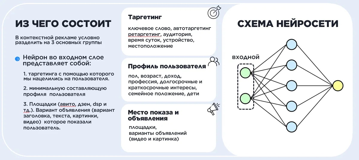 Нейросети основаны на специальном математическом алгоритме, который прогнозирует вероятность перехода по объявлению и достижения целевого действия на сайте.
