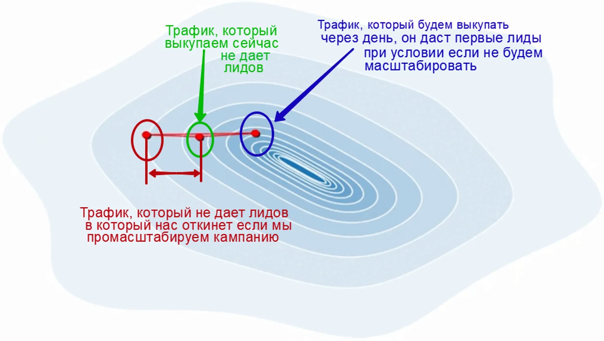 Если промасштабировать кампанию, которая еще не дала лидов, допустим на 3 день. Нас откинет в плохой трафик и кампании нужно будет еще 2 дня, чтобы вернуть прежнее качество трафика и получить первые лиды. По итогу мы не получаем лиды 5 дней.