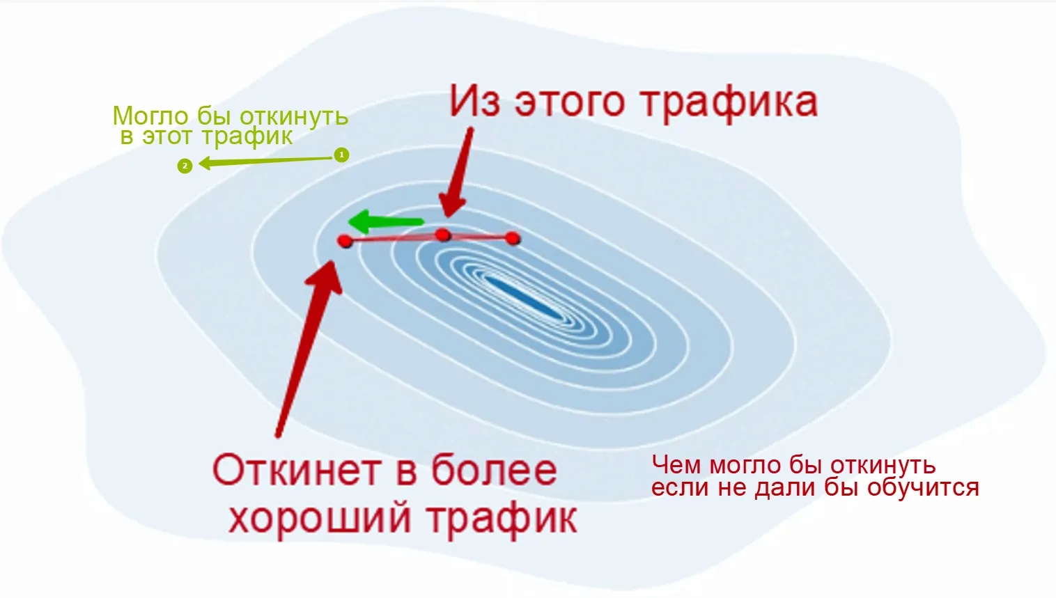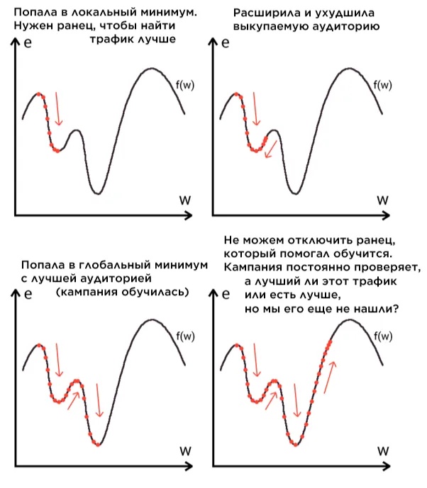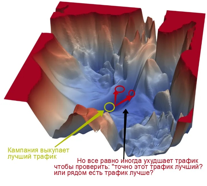 Представим что мы установили определенное значение высоты ранца, на которую он нас поднимает. Без труда смогли преодолеть все локальные минимумы, и добраться до глобального минимума. Так как мы не можем просто отключить реактивный ранец, из-за этого можем проскочить глобальный минимум, если рядом с ним есть еще низины. В конечном случае это не так важно, так как рано или поздно мы все равно вернемся обратно в глобальный минимум (лучший трафик). Этот ранец - расширение и выкуп более плохой аудитории, чтобы понять действительно мы выкупаем хороший трафик или есть трафик лучше, и мы находимся не в глобальном, а в локальном минимуме.