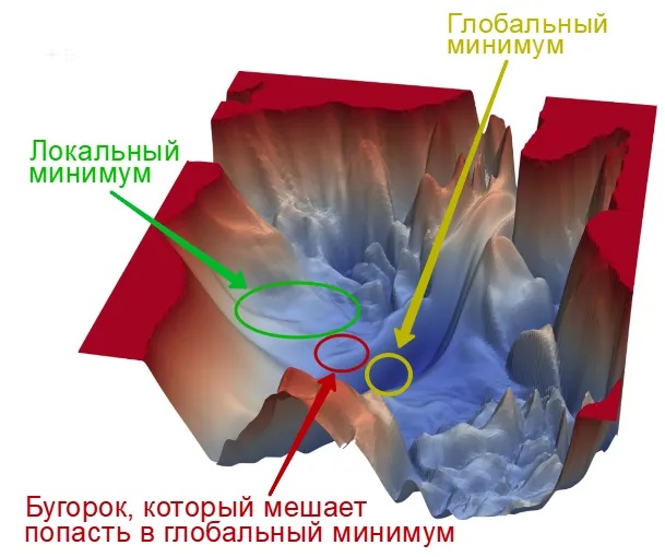 Бугорок (холм) - препятствие между локальным и глобальным минимумом, из-за которого лыжник может запутаться и принять локальный минимум за глобальный.
