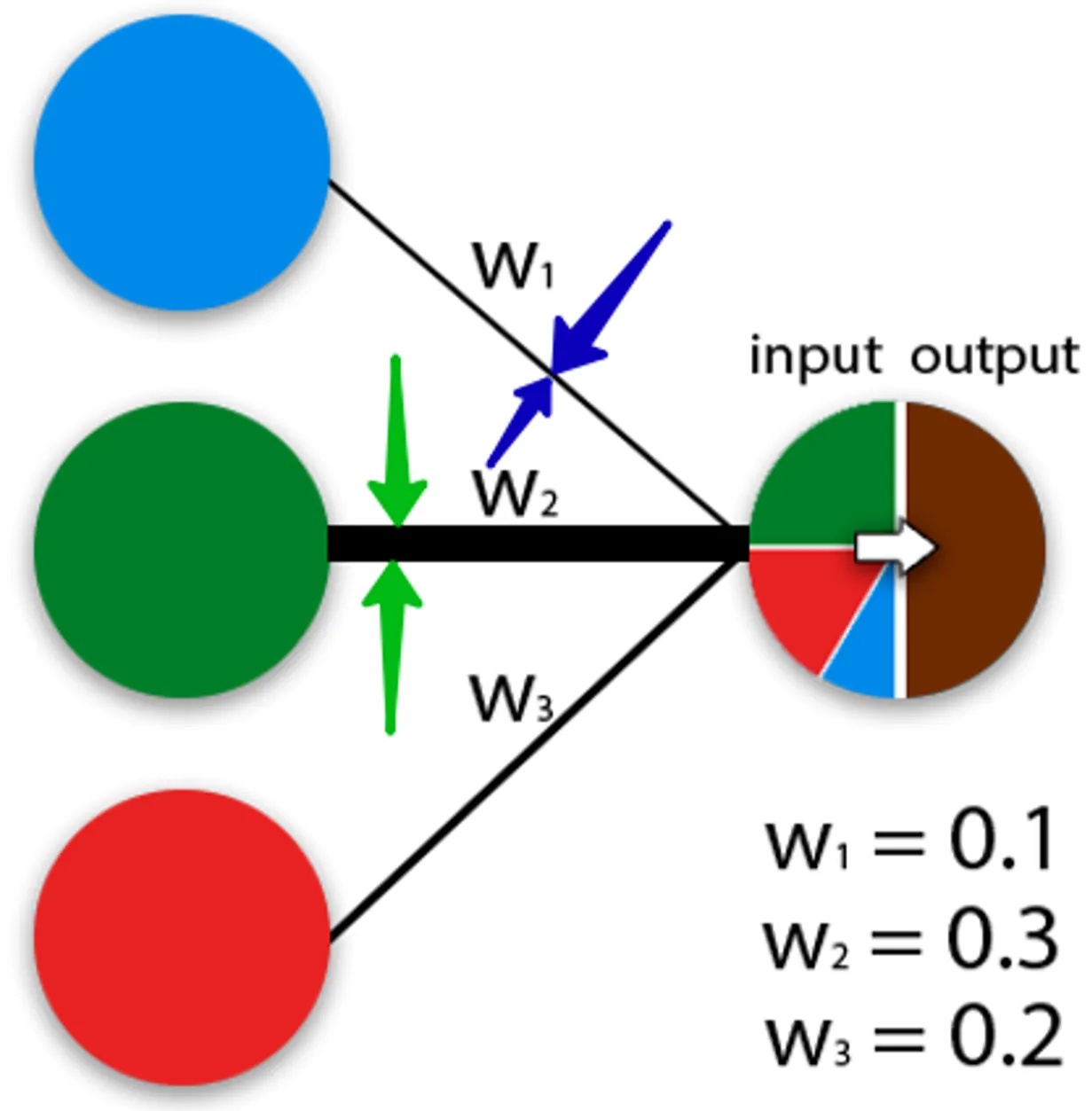 Допустим, есть 3 нейрона, которые передают информацию следующему. Тогда у нас есть 3 веса, соответствующие каждому из этих нейронов. У того нейрона, у которого вес будет больше, та информация и будет доминирующей в следующем нейроне (пример — смешение цветов).