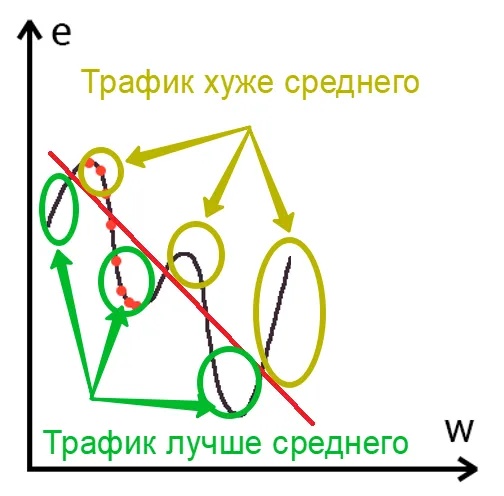 Если приблизится к более реальной картине распределения трафика в РСЯ, его можно представить в виде такого распределения. Где синий - самый конверсионный трафик, красный наименее конверсионный. А сверху спускается лыжник (автостратегия), который пытается попасть в самый низ (выкупить самый конверсионный трафик).
