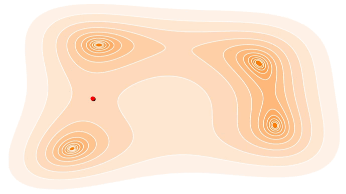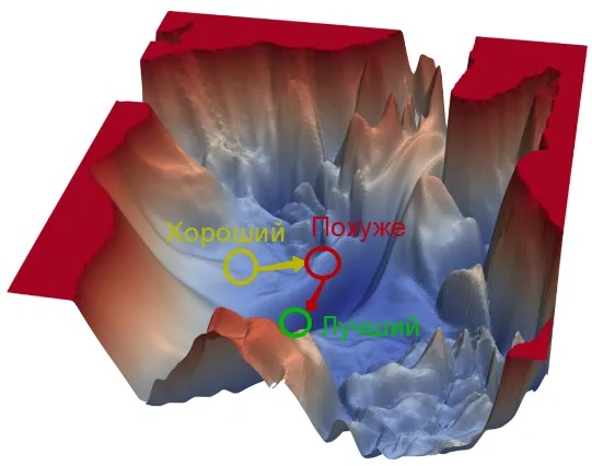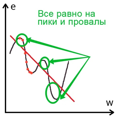 Теперь лыжнику нужно спуститься вниз, с помощью градиента. Если склон будет с 1 минимумом, то после n-ого количества спусков мы доберемся до низины. Это хорошо видно в анимации обучения поисковых кампаний. Но в большинстве случаев склон (график функции) будет волнистый с несколькими минимумами и наш лыжник столкнется с очень серьезной проблемой — локальный минимум.