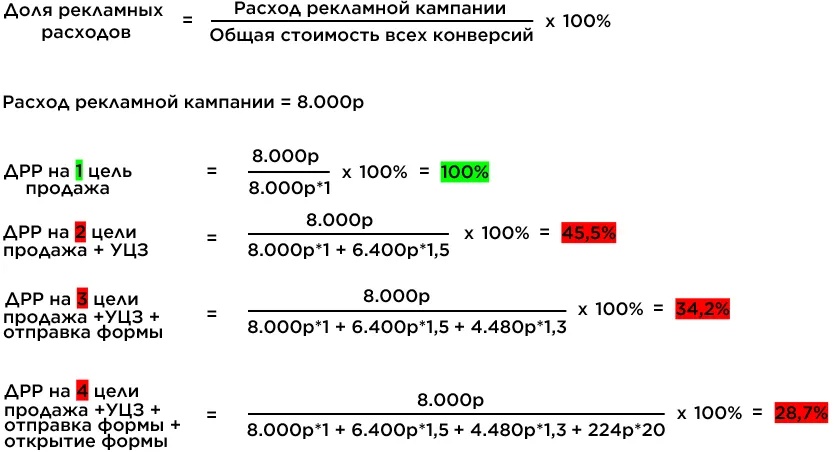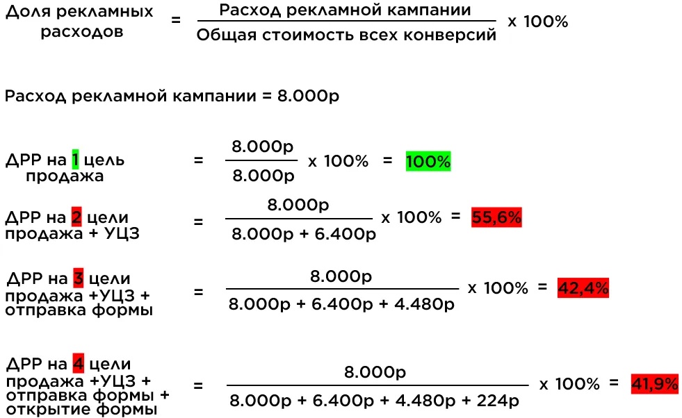 - 0.25224р140 (открытия формы) + 0.2544807 (отправки формы) + 0.2564005 (УЦЗ) + 0.2548000 (звонки в отдел продаж) = 32 000р / 4 лида = 8000р за лида (равно фактически заработанным нами деньгам - по 8000 за 4 звонка в отдел продаж) *понятно, что мы зарабатываем с этого другую сумму, но, поскольку, мы указываем 100% ДРР, то это, как бы, столько, сколько мы заработали - 100% от прибыли цели