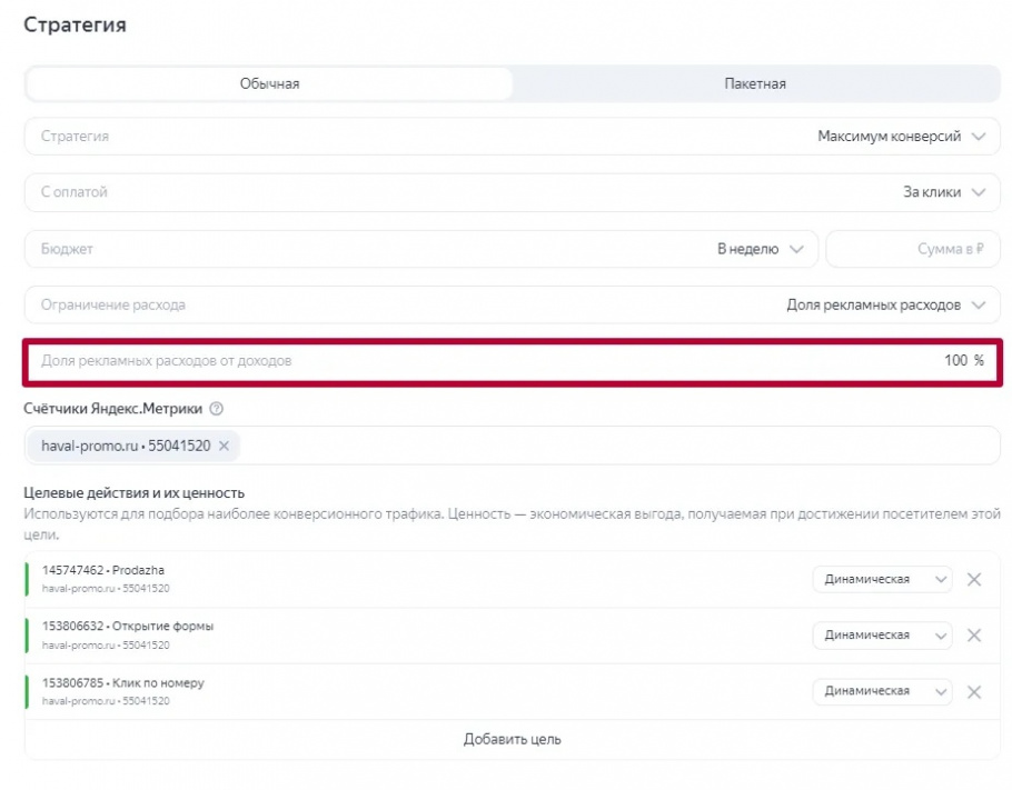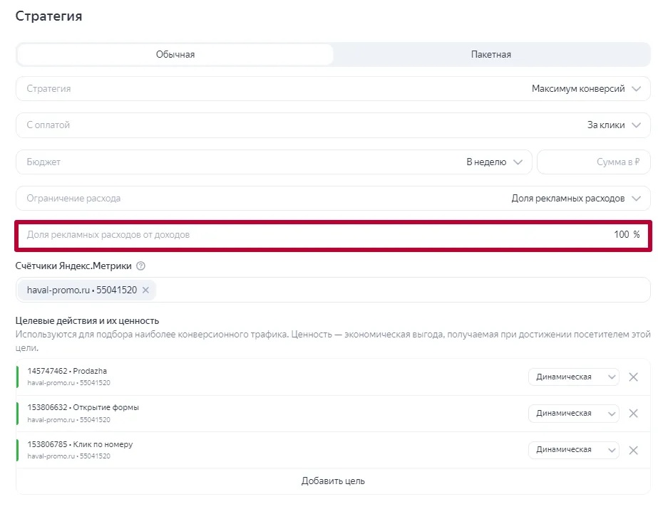 Далее, необходимо цену конверсий посчитанную для оптимизации конверсий, умножить на 0.25. Это и будут стоимости целей, которые необходимо указать в стратегии ДРР. Так мы поступаем для каждой воронки целей в проекте.