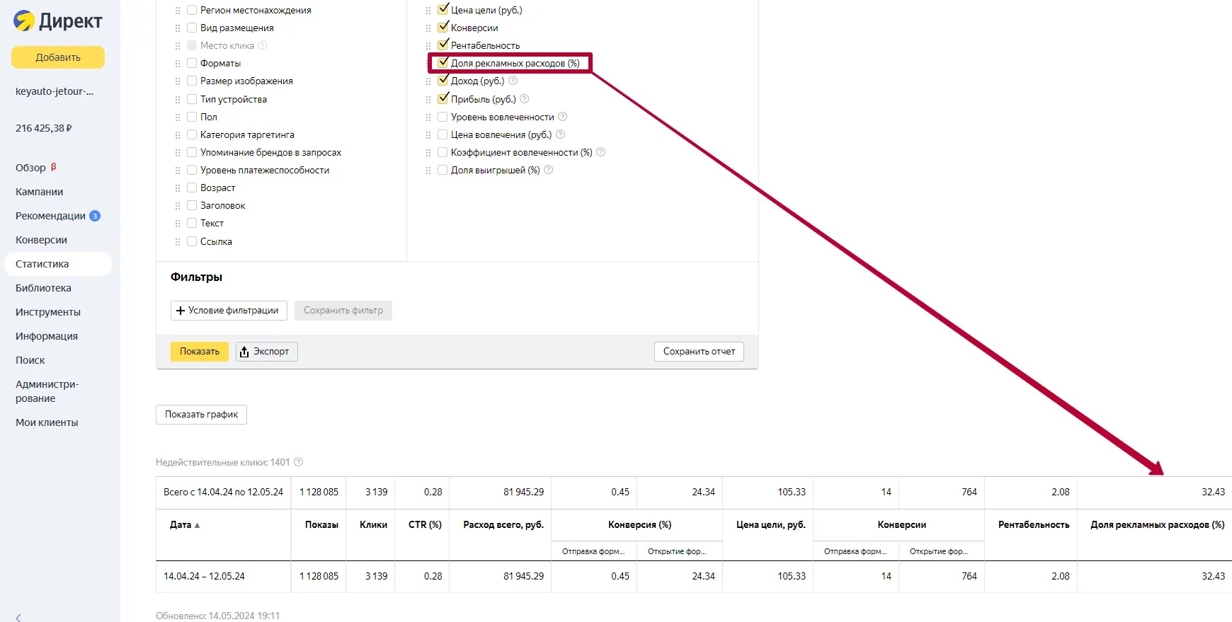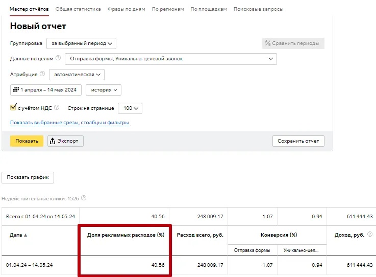 В доли рекламных расходов “связывает” конверсии показатель установленного ДРР в настройках кампании. Из-за него мы должны делить стоимость звонка в отдел продаж на количество конверсий и распределять стоимость на все конверсии.