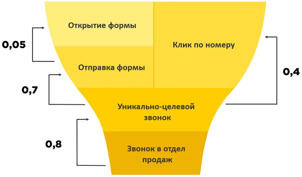 В случае пересекающихся воронок с теми, для которых уже посчитаны доли (как, например: клик по номеру → уцз → ОП), математика становится сложнее. Открытие формы и отправку формы заменяет клик по номеру телефона и считаем параллельную воронку с меньшим количеством целей.